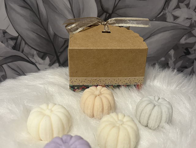 Ensemble de 5 fondants citrouille de 20g chacun. Senteurs : madeleine, prune des fées, confiture de lait, orchidée blanche et vanille oud.